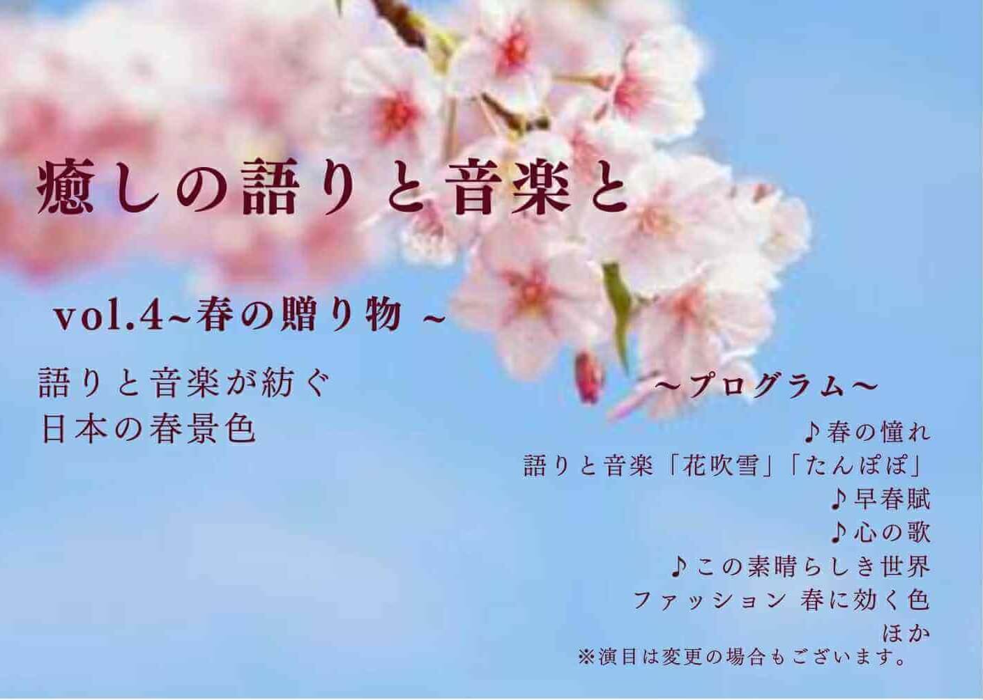 2016年の4月より四季毎の「色と音 癒しの語り&コンサート」を開催しています。